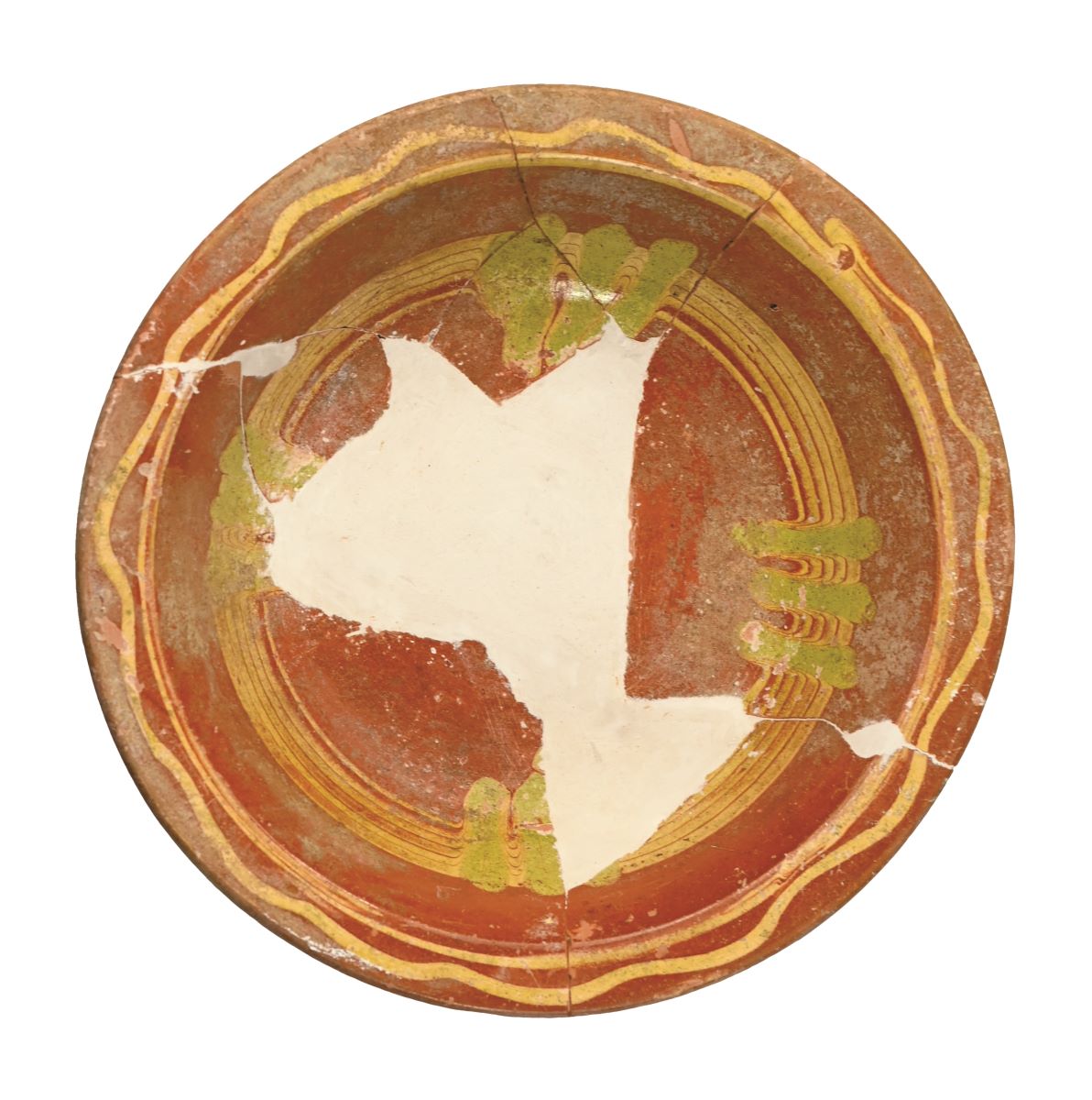 Descriere: Vas de formă tronconică, cu baza plată, pereții evazați și buza lată, cu marginea rătunjită. Acoperit la interior cu smalț maroroșcat, peste care a fost aplicat cu un motiv geometric de culoare galbenă. Pe pereți se observă șase linii concentrice,