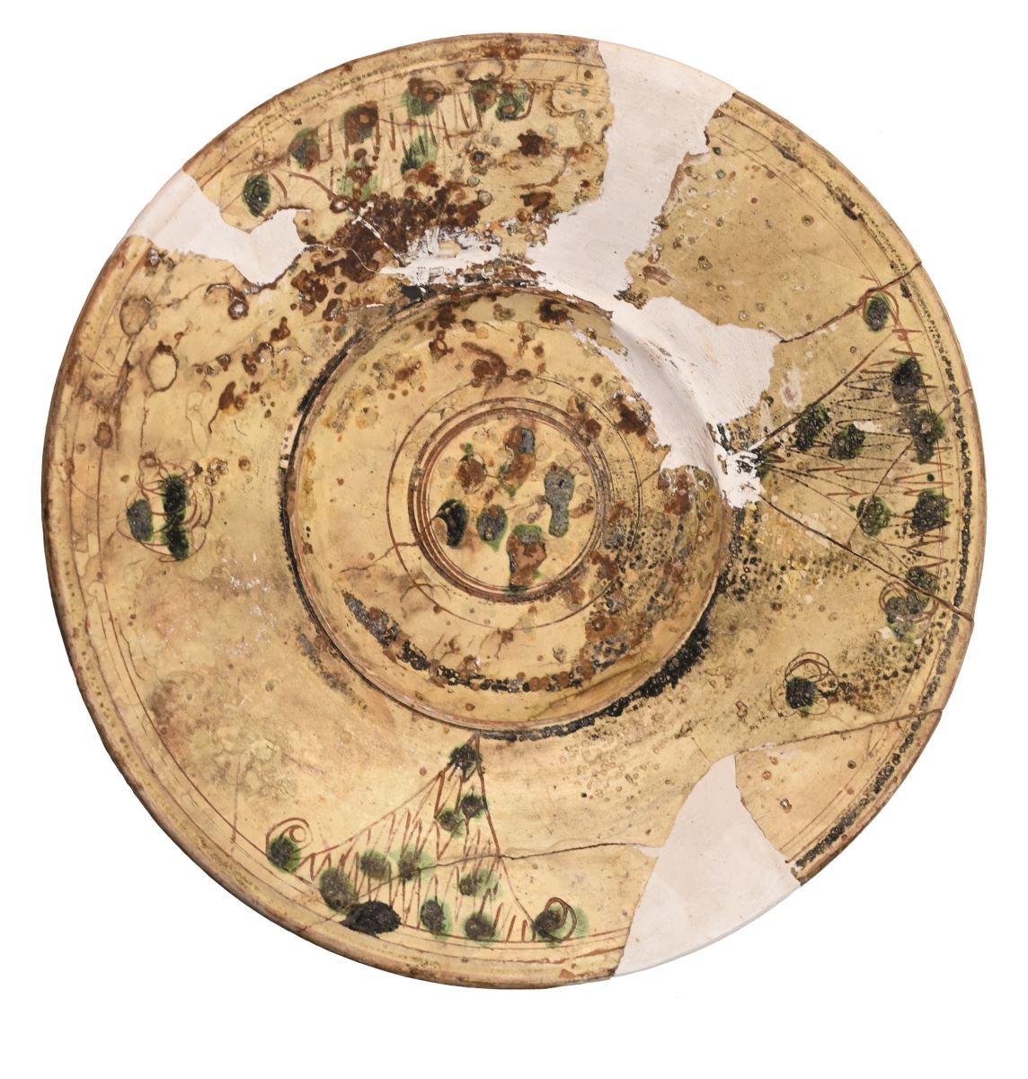 Descriere: Farfurie întinsă, cu baza plată, pereții evazați și buza lată, cu marginea teșită. Suprafața interioară a fost acoperită cu humă albă, peste care a fost aplicat un strat de smalț incolor. Pe buză, între linii circulare incizate, se observă trei triunghiuri sgrafitate având la bază, de-o parte și de alta, câte o volută. Interiorul triunghiurilor este decorat cu linii vălurite sgrafitate, acoperite cu pete de smalț verde. Registrul central este format din cinci cercuri concentrice, conținând șase pete de smalț verde.