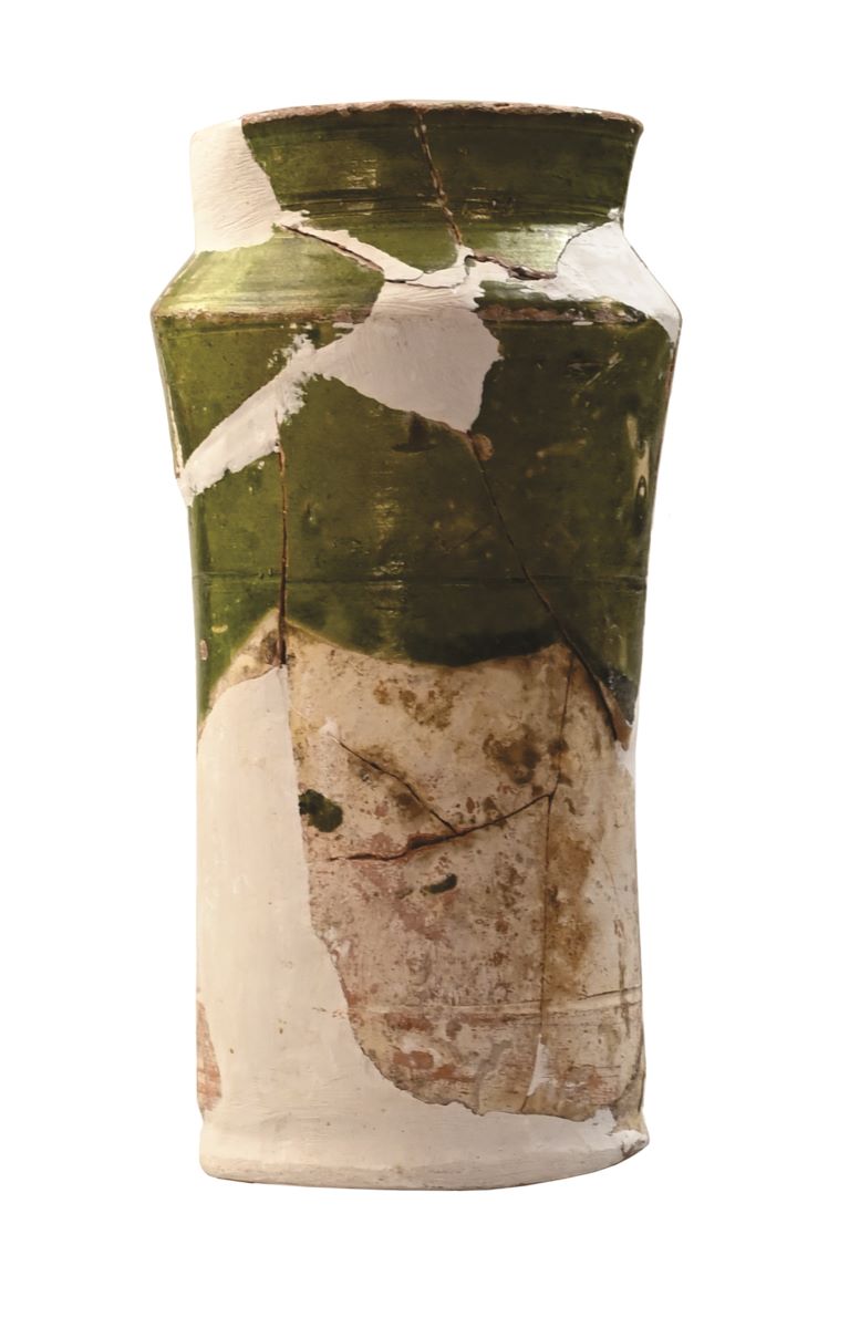 Descriere: Corpul, de formă cilindrică, are diametrul maxim în zona umărului. Vasul prezintă o buză evazată, gât scurt, umăr profilat și bază plată. Este acoperit la exterior cu humă albă, iar jumătatea superioară este acoperită și cu smalț verde. Sub buză, în zona gâtului, deasupra și sub umăr, în zona centrală și în partea inferioară a corpului, se observă șănțuiri ușoare. Gura vasului este ușor deformată. La exteriorul vasului se observă câteva pete de smalț scurs.