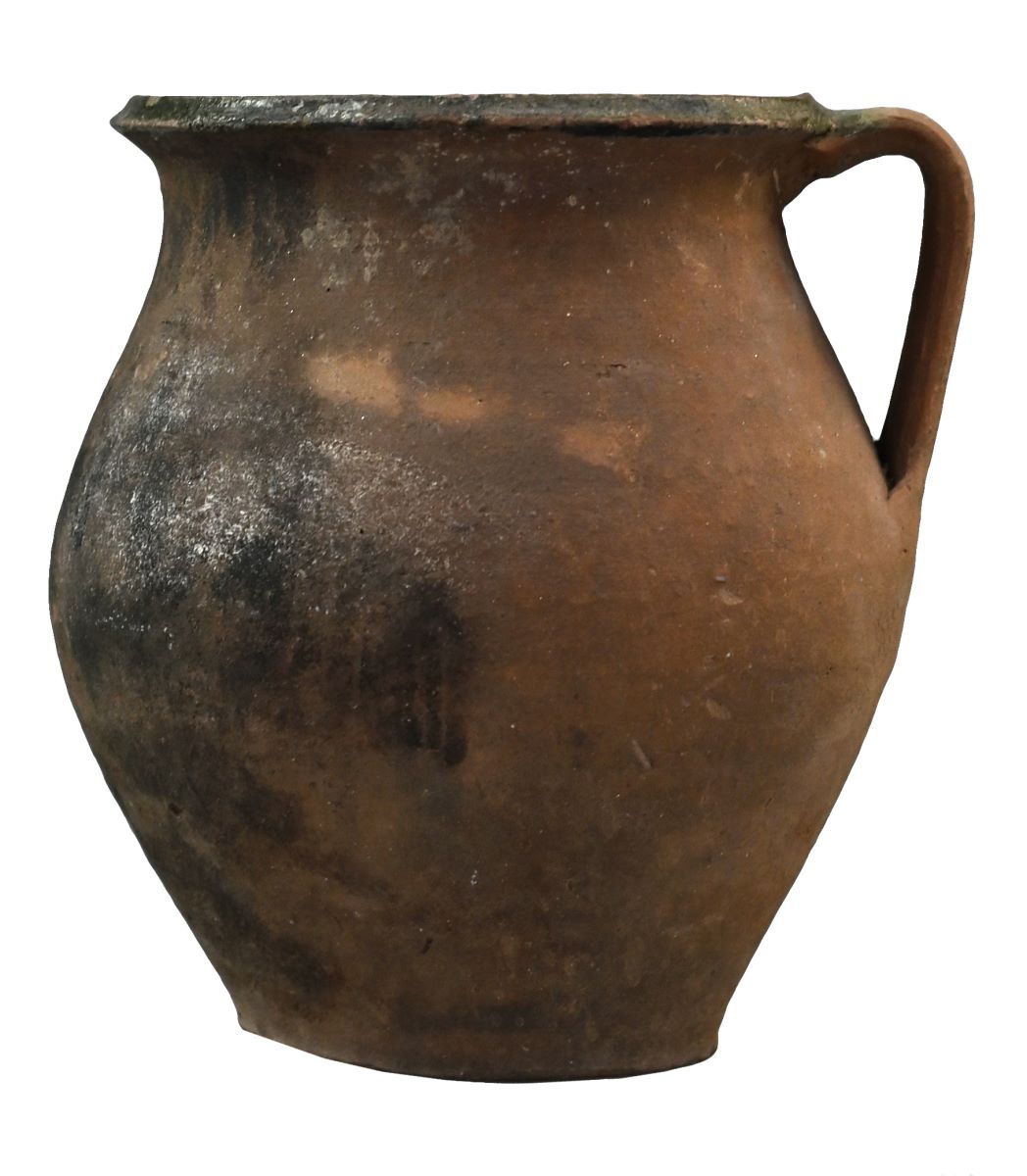 Descriere: Oală cu bază plată și corp ovoidal, având o buză evazată cu marginea teșită spre exterior. Este prevăzută cu o toartă lată, atașată în partea superioară de buză și în partea inferioară în zona diametrului maxim. La exterior, pe buză și pe partea superioară a toartei, a fost aplicat un strat de smalț verde.