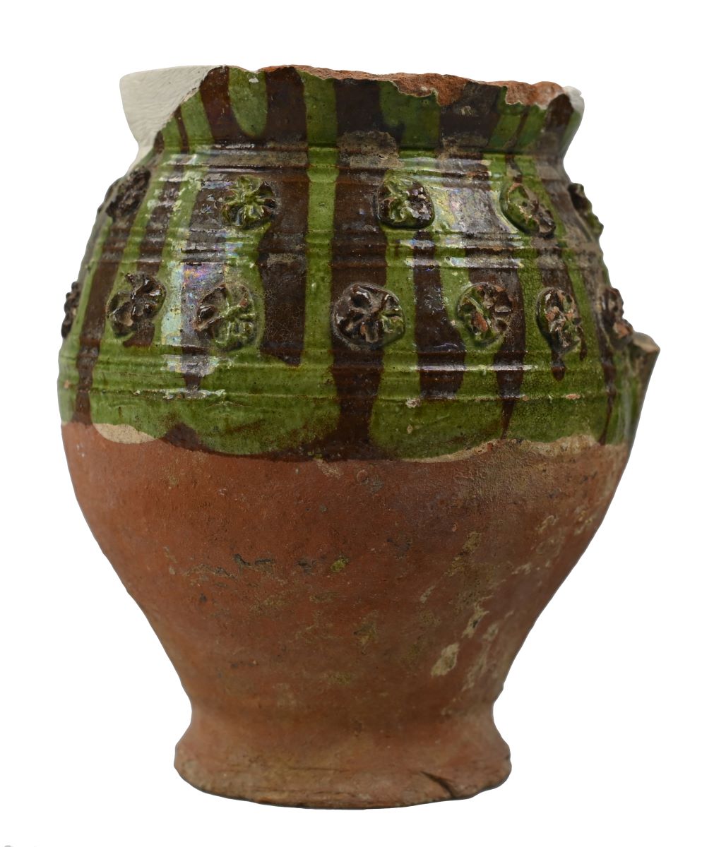 Material / Tehnica : recipient din lut ars, lucrat la roată, smălțuit cu verde, decorat cu pastile de lut imprimate.