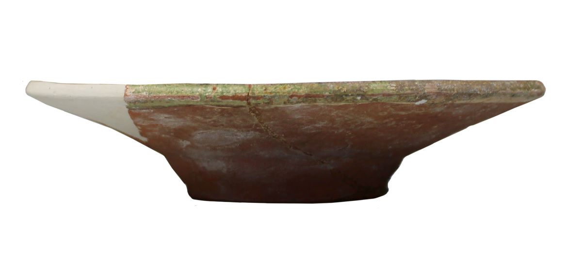 Descriere: Farfurie întinsă, cu baza plată, pereții evazați și buza lată, cu marginea rotunjită. Piesa a fost acoperită cu angobă albă, iar la interior a fost aplicat un strat de smalț verde.