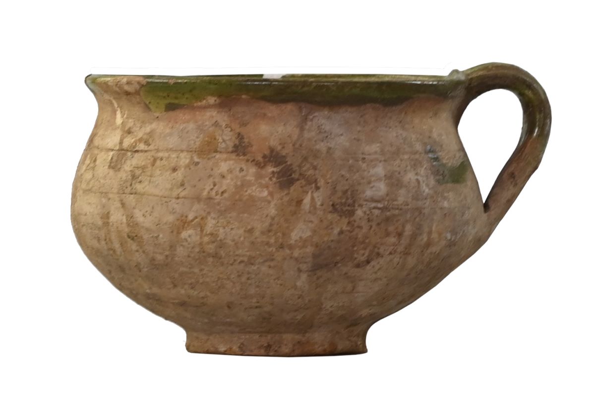 Descriere: Cană de formă globulară, cu baza înălțată plată, pereții arcuiți, buza ușor evazată și toarta ușor supraînălțată, ce se prinde cu atașul superior de buză și cu cel inferior în zona diametrului maxim. Acoperită la interior și pe partea superioară a toartei cu smalț verde deschis. În zona umărului se observă două caneluri.