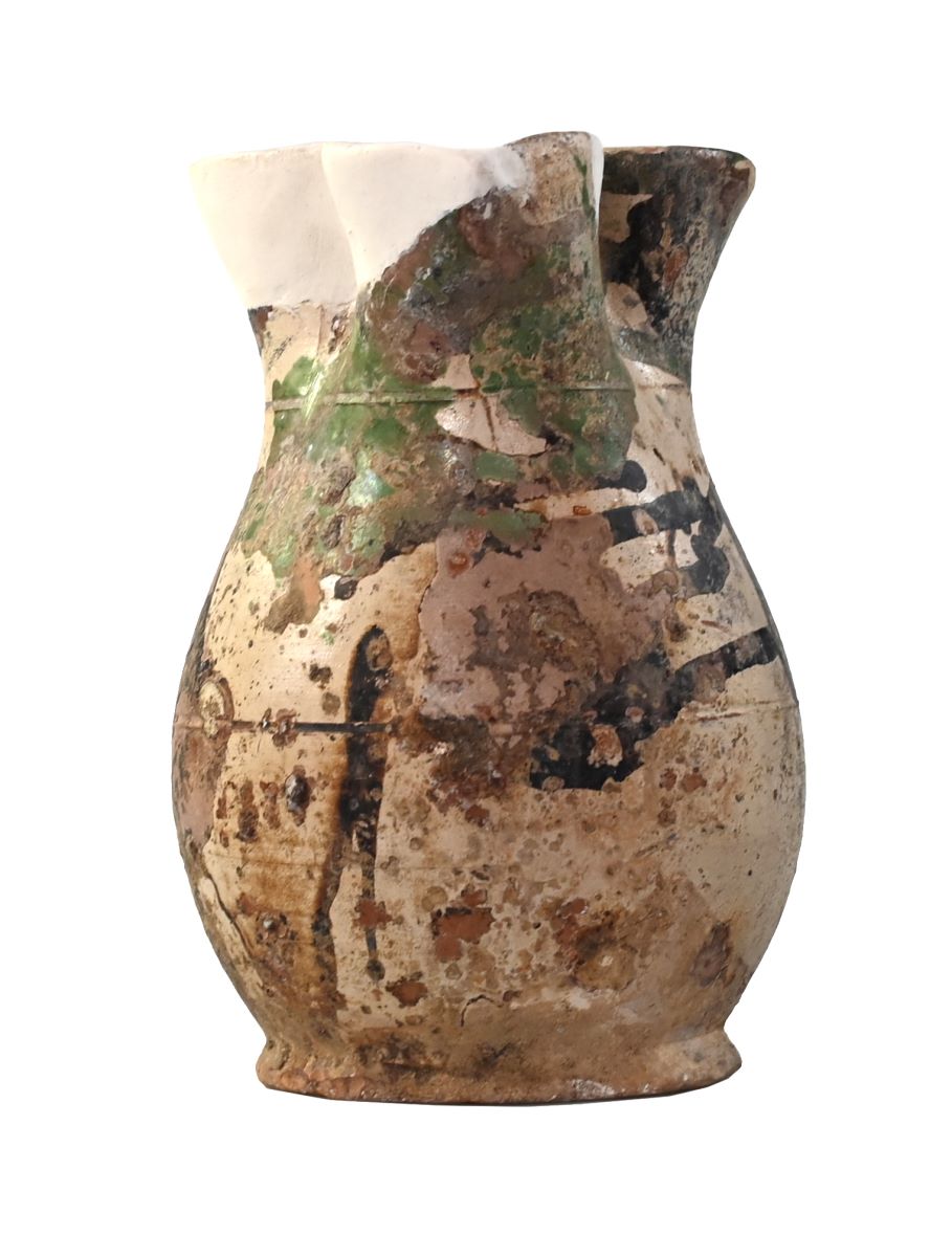 Descriere: Cană cu baza plată, pereți arcuiți, gură trilobată, având o toartă lată, atașată în partea superioară de buză și în partea inferioară în zona diametrului maxim. În zona gâtului și în zona circumferinței maxime se observă câte o canelură. Acoperit cu angobă albă peste care a fost aplicat smalț transparent, precum și un o serie de pete verzi și negre de formă neregulată.