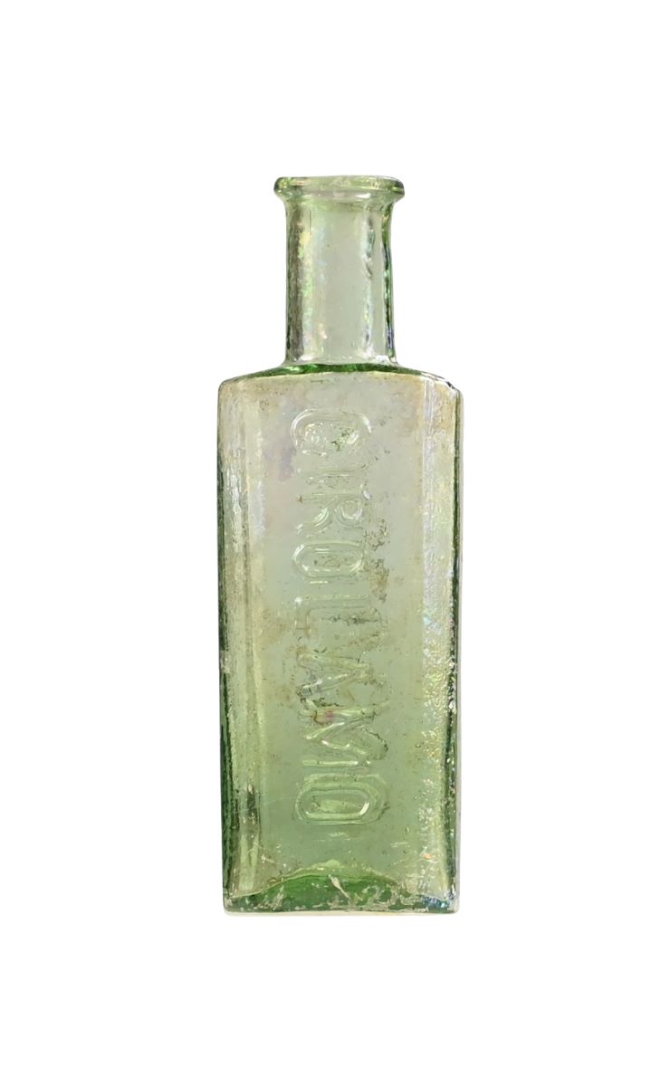 Descriere: Flacon din sticlă verde deschis, transparentă, cu baza ușor concavă și pereți multifațetați. Gâtul este alungit, de formă cilindrică, terminat cu o gură ușor evazată, având marginea îngroșată. Pe una dintre fețe se află, în relief, inscripția „PAGLIANO”, iar pe cealaltă „GIROLAMO”, indicând numele inventatorului și produsul farmaceutic pe care recipientul îl conținea inițial.