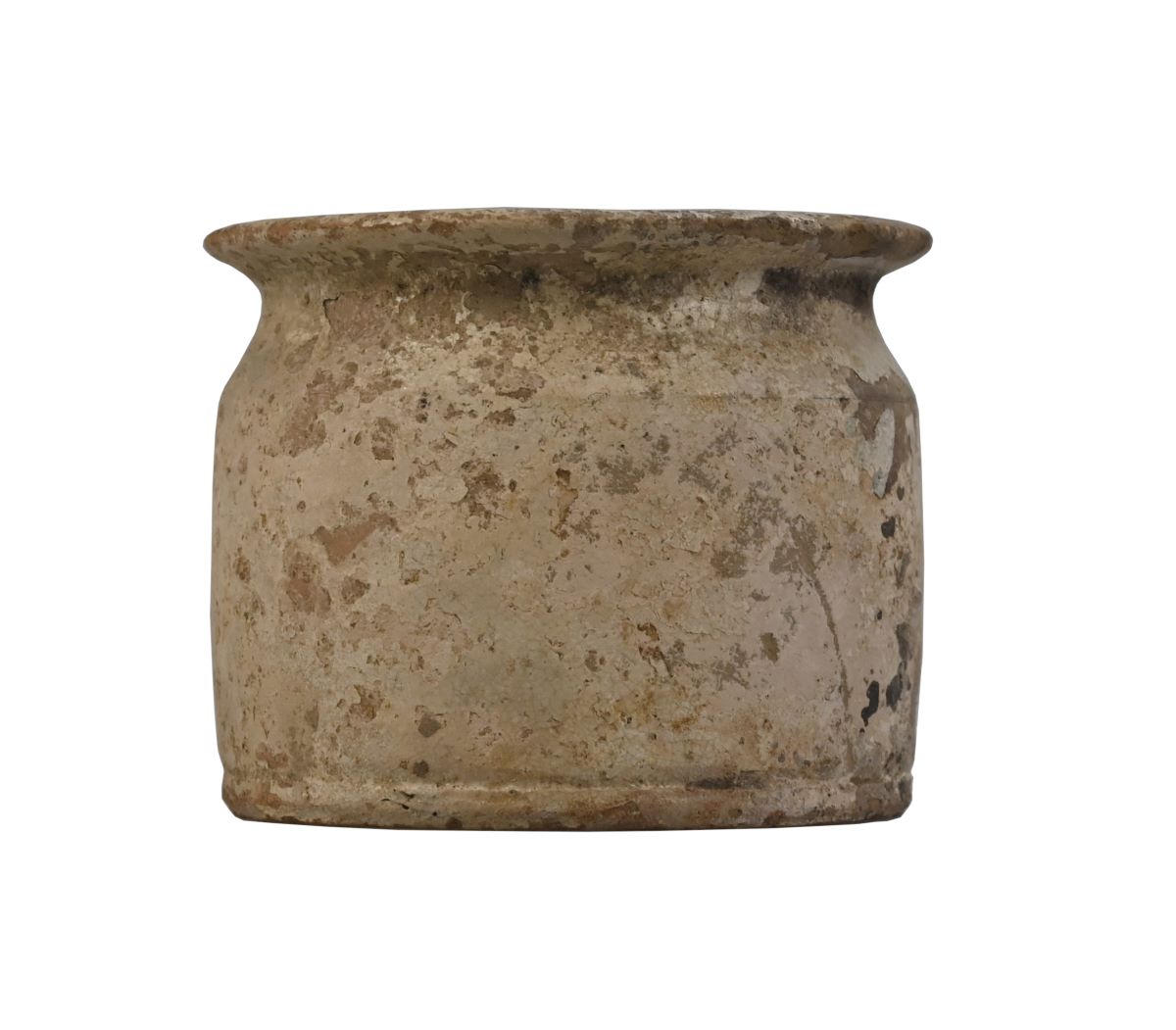 Descriere: Borcan farmaceutic, cu bază plată, pereți drepți, gât retras și buză evazată cu marginea rotunjită. Deasupra bazei se observă o canelură superficială. Acoperit cu un strat de angobă alb-gălbuie, peste care a fost aplicat un strat de smalț transparent.