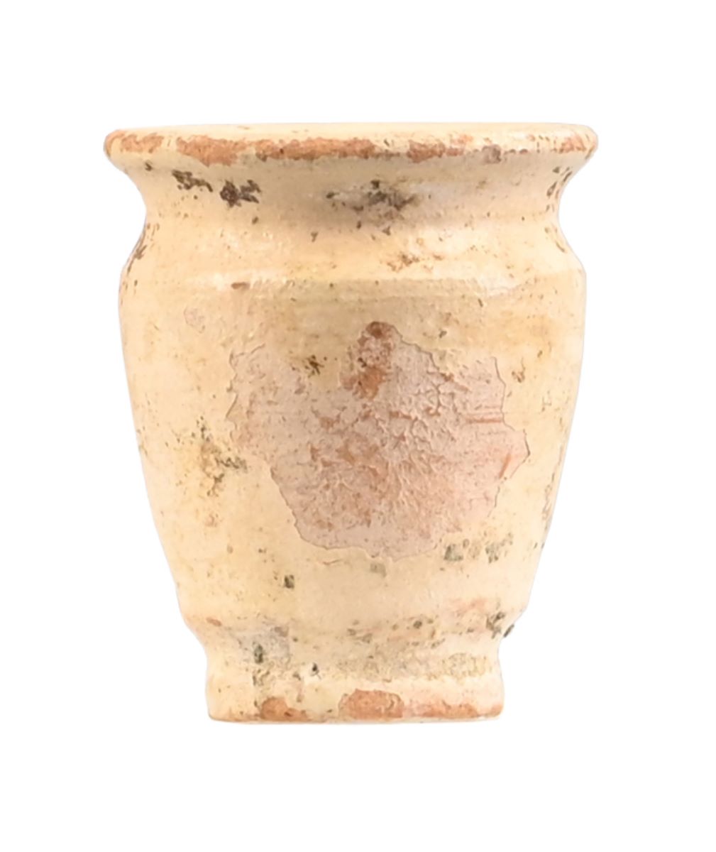 Descriere: Vas medicinal cu pereți evazați și bază plată. Gâtul este ușor retras, terminat cu o buză evazată, prevăzută cu margine rotunjită. Acoperit cu un strat de humă alb-gălbuie, peste care s-a aplicat un strat de smalț transparent.