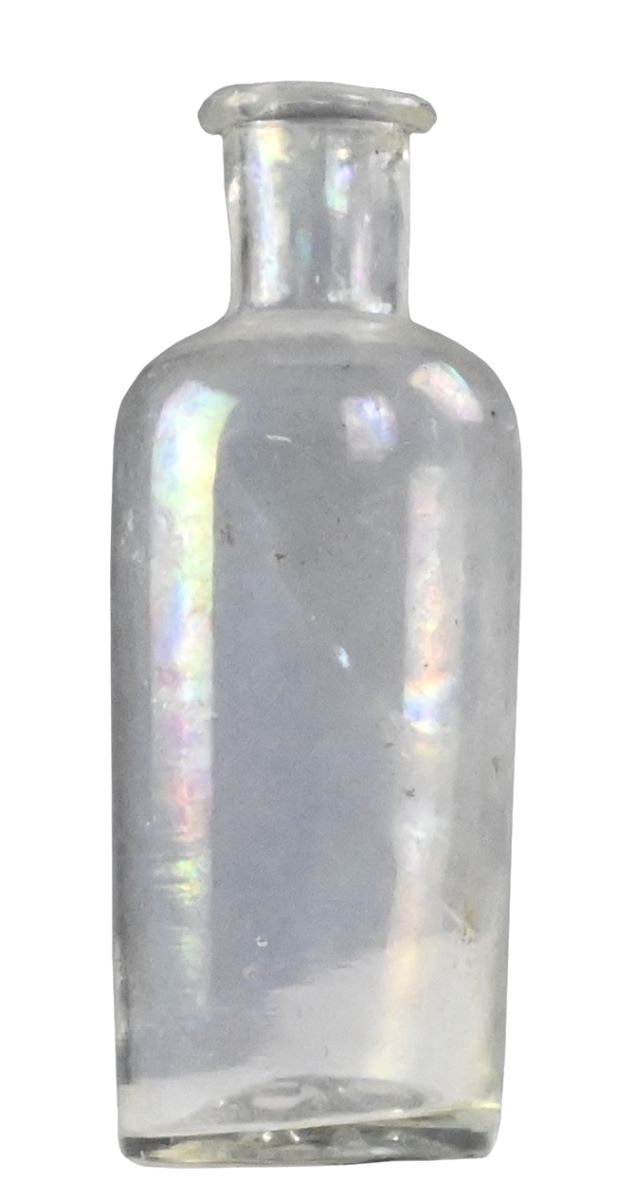 Descriere: Vas din sticlă transparentă, cu destinație farmaceutică, corp cilindric, gât subțire cilindric, buza răsfrântă orizontal. Pe fund prezintă imprimat gramajul "40" încadrat întru-un cerc simplu.